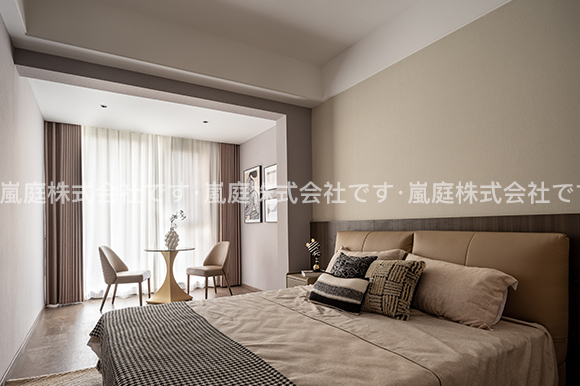 このインテリアはモダンでライトラグジュアリーなスタイルで、高級素材とニュートラルトーンが主で、ラインがシンプルで、質感と優雅さを兼ね備えている